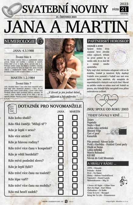 Můžete si přečíst, co se hrálo v kině, nebo jaké písničky byly hitem v roce seznámení. Součástí svatebních novin je také partnerský horoskop, který prozradí, zda se k sobě znamení podle horoskopu hodí.