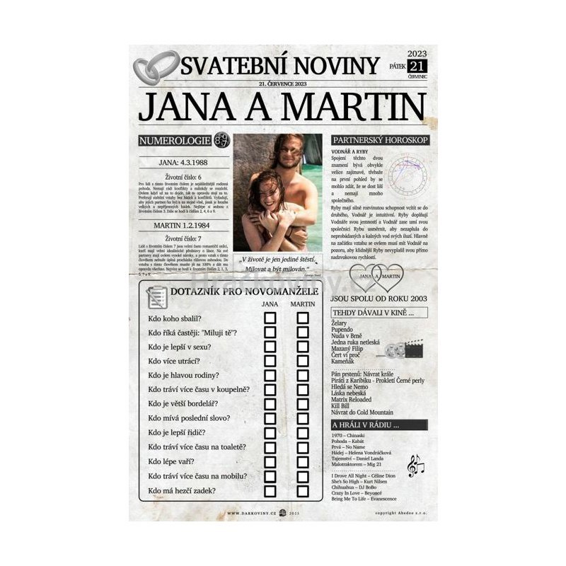 Svatební noviny na zakázku podle vašeho přání. Vytištěné svatební noviny na formátu A4. Svatební noviny je skutečně originál dárek, který vytváříme graficky na míru dle vašeho zadání. Zjistíte tak, co se hrálo v kině, nebo jaké písničky byly hitem v roce seznámení. Součástí svatebních novin je také partnerský horoskop, který prozradí, zda se k sobě znamení podle horoskopu hodí. Jestli už teda není pozdě. Zpracovali jsme již více než tisícovku dárků na zakázku včetně novin. Výsledek byl vždy velmi originální a dárek je skutečně osobní a jedinečný.
