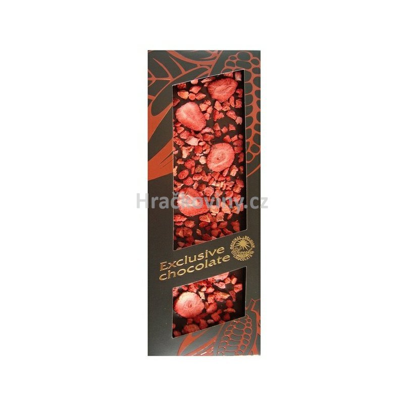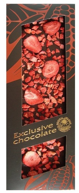 Dopřejte si jedinečné spojení kvalitní hořké čokolády s vysokým obsahem kakaa a křupavých kousků sušených jahod. Výrazná, plná chuť čokolády s jemně nahořklými tóny se dokonale snoubí se sladkokyselou svěžestí jahod, která každému soustu dodává lehkost a ovocný akcent.