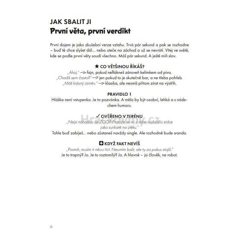 Tahle příručka tě naučí, že první věta není všechno – ale může být začátek všeho. Skvělý dárek pro single kamarády i jako odlehčené čtení pro páry! Tahle kniha ti dodá odvahu i šarm – abys při balení neztratil hlavu, koule ani budoucnost. Rozměr: 130 × 170 mm, měkká vazba. Počet stran: 100. ISBN: 978-80-909636-1-0