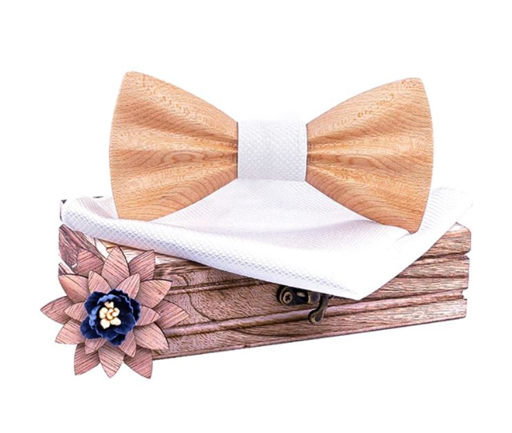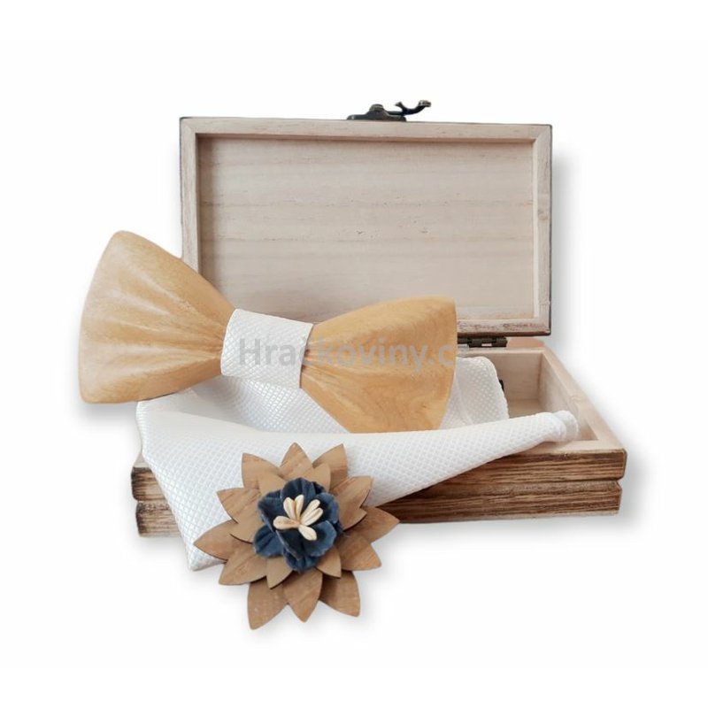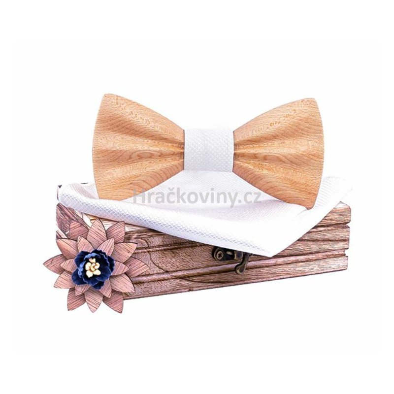 Dřevěný motýlek spolu s kapesníčkem v bílé barvě a broží do klopy se skvěle doplňují. Světlé přírodní dřevo jedinečně doplňuje jemný proužek s kapesníčkem v bílé barvě. Decentní design a přírodní materiál kombinovaný s textilií tvoří luxusní kompozici. Dřevěný motýlek je díky exotickému 100% přírodnímu, dřevěnému materiálu velmi lehký a s pomocí nastavitelného, elastického pásku obepne každý krk. Budete mít jistotu, že se motýlek nikdy nerozváže a neupadne. Dárkové balení, rozšířené o brož a kapesníček ve stejném odstínu jako je středová stuha motýlku, ještě více podtrhne osobitou krásu netradičního módního doplňku.