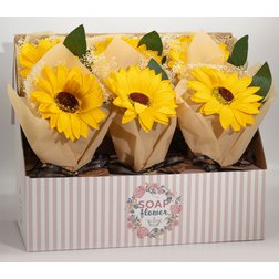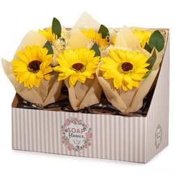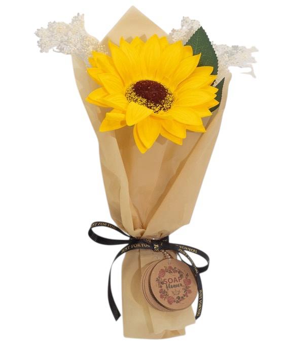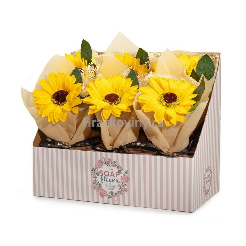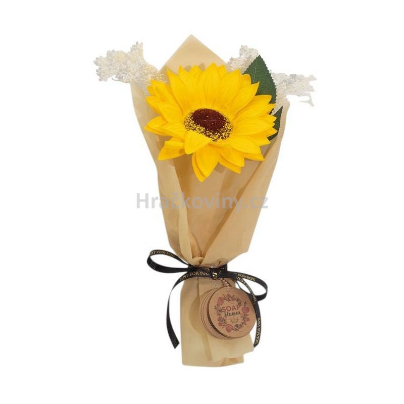Balení obsahuje 1 ks mýdlové slunečnice uvázané v dárkové kytici.