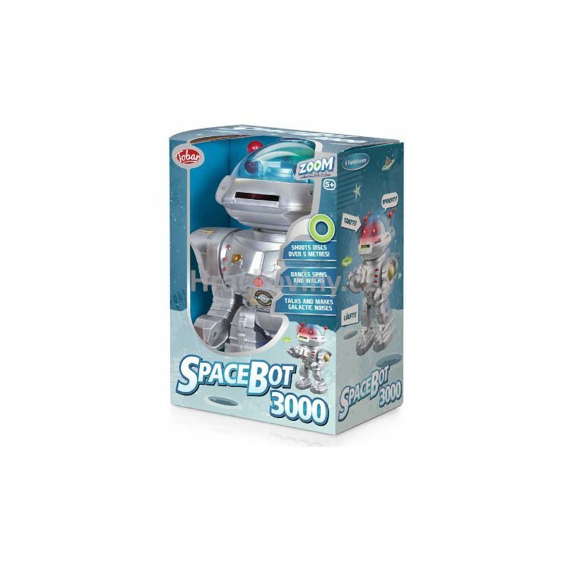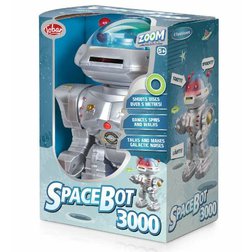 Robotičtí nadšenci si s robotem Zoom Spacebot 3000 užijí hodiny zábavy. Jednoduše použijte infračervené dálkové ovládání k aktivaci šesti skvělých funkcí. To zahrnuje vystřelování barevných pěnových kotoučů z jeho tlamy – přistání až na vzdálenost pěti metrů. Také tančí, točí hlavou a chodí do stran, dopředu i dozadu.