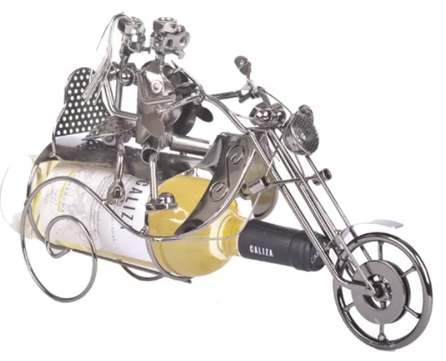 Kovový stojan na víno Motorkář, který brzdí až u skleničky.