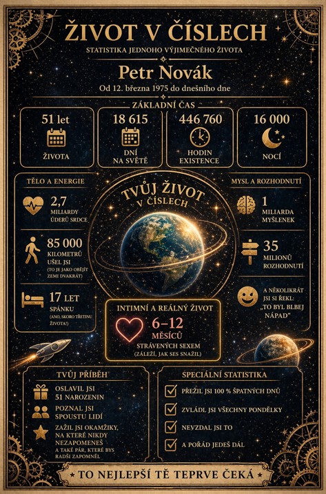 Život v číslech je originální personalizovaný plakát velikosti A3, který promění obyčejné datum narození v silný a překvapivý příběh. Stačí zadat jméno a datum narození a vznikne jedinečný vizuál na míru, který ukazuje život člověka pomocí zajímavých a často i vtipných statistik. Kolik dní už má za sebou, kolik hodin žije, kolik let prospal, kolikrát mu bilo srdce nebo kolik rozhodnutí v životě udělal – některá čísla jsou přesná, jiná jsou chytrým odhadem, ale dohromady vytvářejí celek, ve kterém se každý okamžitě pozná.