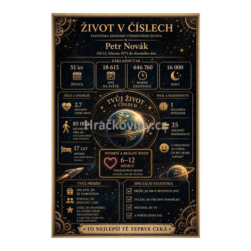 Díky tomu je „Život v číslech“ ideální jako dárek k narozeninám, výročí nebo pro kohokoliv, komu chcete dát něco osobního a nezapomenutelného. Není to jen plakát, ale vizuální připomínka života, která dokáže pobavit, dojmout i překvapit zároveň. Hodí se pro muže i ženy a často končí vystavený doma nebo sdílený mezi přáteli, protože přesně vystihuje to nejdůležitější – že každý život je jedinečný a stojí za to ho vidět z trochu jiné perspektivy.
